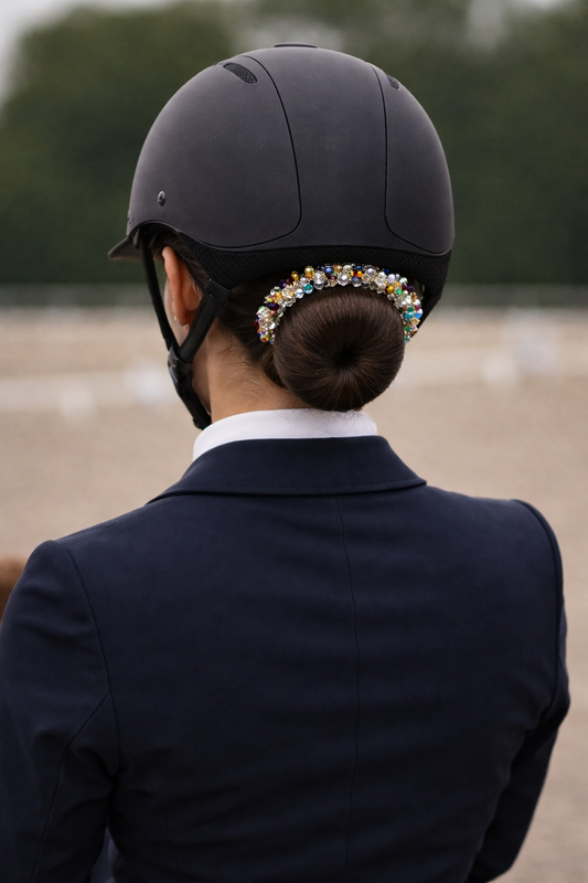 Dank des elastischen Designs lässt sich das Accessoire sicher und einfach um den Dutt legen, ohne zu verrutschen – auch während der Prüfung. Ein stilvolles Detail für Reiterinnen, die Wert auf Präzision, Eleganz und einen professionellen Auftritt legen.